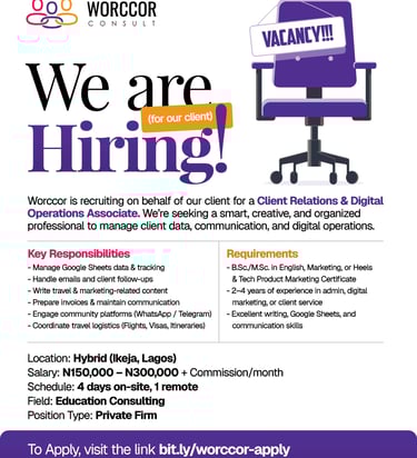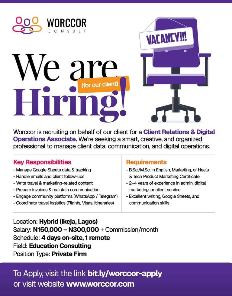 Worccor is recruiting on behalf of our client for a Client Relations & Digital Operations Associate role. We’re looking for a smart, creative, and organized professional to manage client data, communication, and digital operations.